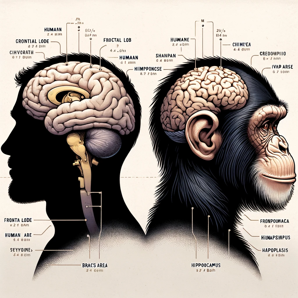 인간의 뇌는 침팬지의 뇌보다 훨씬 크다. 사람의 뇌는 약 13001500cc 정도인데, 침팬지의 뇌는 350400cc 정도다. 특히 인간의 뇌에서는 앞쪽에 있는 "전두엽"이라는 부분이 많이 발달했다. 이 부분은 문제를 해결하거나, 계획을 세우고, 다른 사람과 잘 어울리는 데 중요한 역할을 한다.